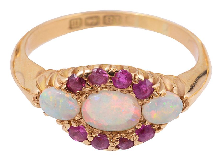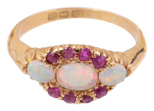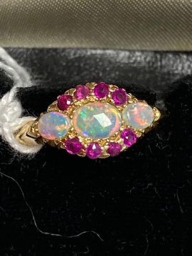 Condition:Overall condition good/very good - little sign of wear. Opals well matched with good play of colour including red/Orange. Rubies: well matched for colour and bright. Hallmark crisp except for rubbed ?maker's mark