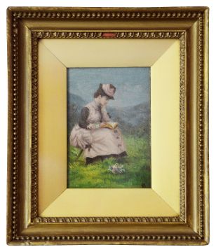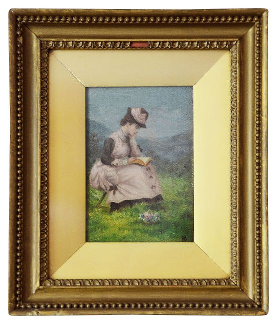 'Seated lady reading a book in a landscape', oil on canvas board, bears monogram bottom right MB, dated 1881, gilt gesso frame