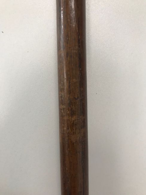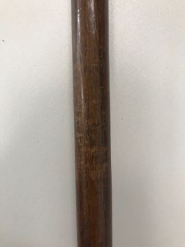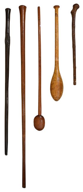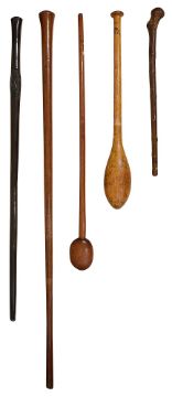 the tapered shaft with an ovoid end, together with an ebony tribal stick, with a hatched carved band, a tapered mahogany staff, a briar shillelagh and an exercise baton (5),.Knobkerrie 78cm, staff 116cm, stick 97cm,.Condition:The baton badly scratched. Small split to stem of knobkerrie, see image. Some scratches to the mahogany staff.