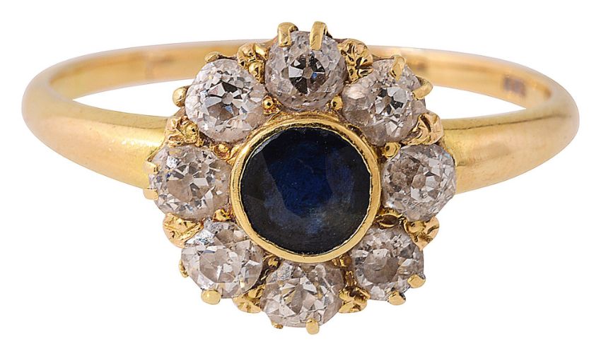 the circular mixed-cut sapphire collet-set above a cushion-shaped old brilliant-cut diamond surround, plain tapering shank stamped '18'