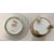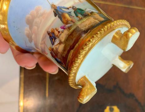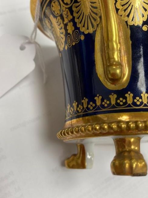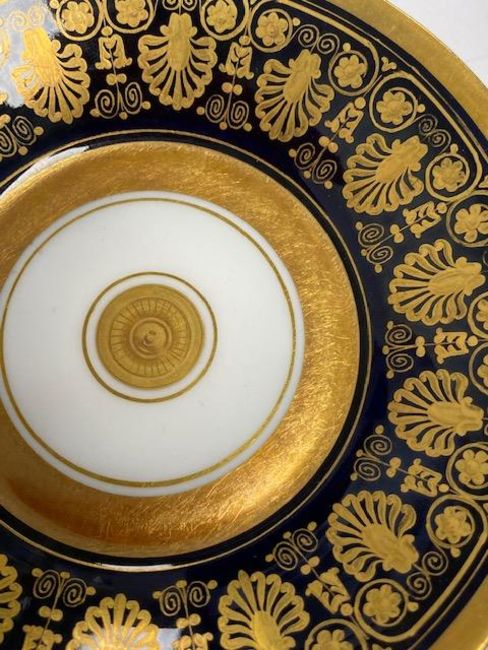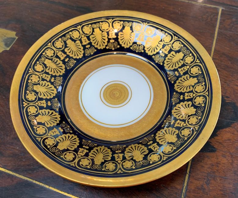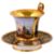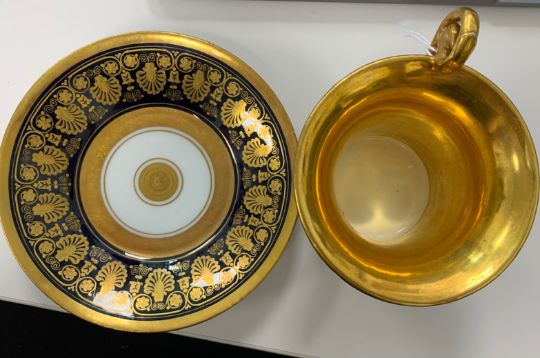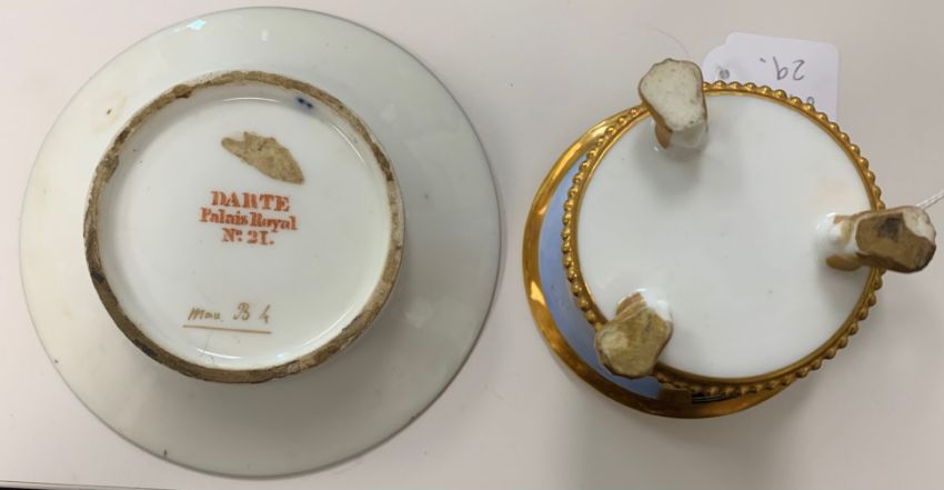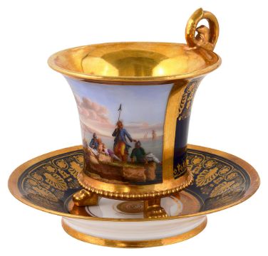 French, 19th century, cup decorated with panel of harbour scene with soldiers to foreground, against gilt ground, beaded base rim raised on lion paw feet, the saucer decorated with gilt against a blue ground, marked to underside in red 'Darte, Palais Royal, No. 21' and further marked 'mau. B4'