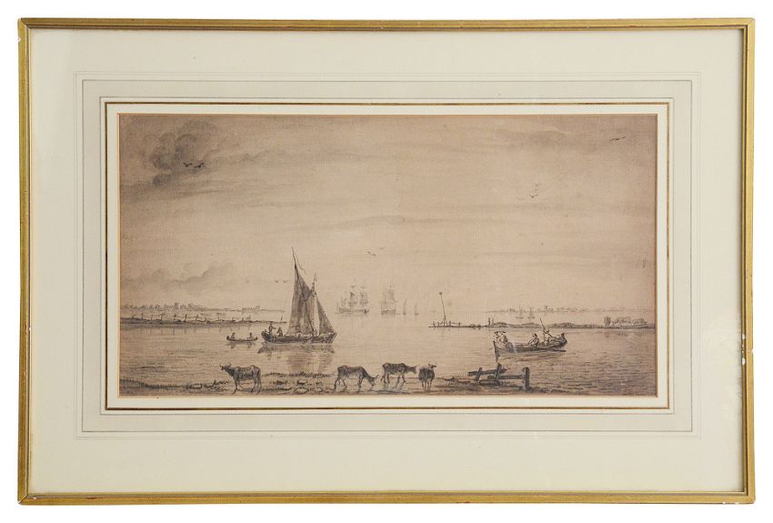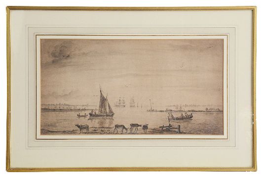 Dutch school (late 18th century)'Estuarine landscape with, sailing boats, tall ships and grazing cattle', bears initials bottom right C.L. mounted, framedwithin mount 24.5 x 46 cm., overall 42.5 x 62.3 cm.Condition:Fair condition, overall toning to paper.