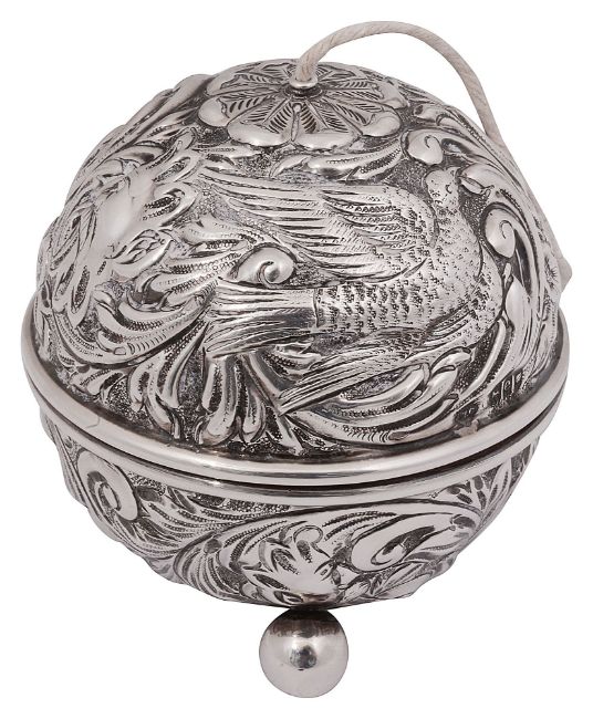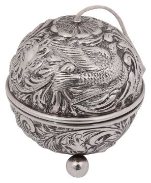 spherical with pull off cover and embossed with birds, flowers and foliate scrolls, on ball feet