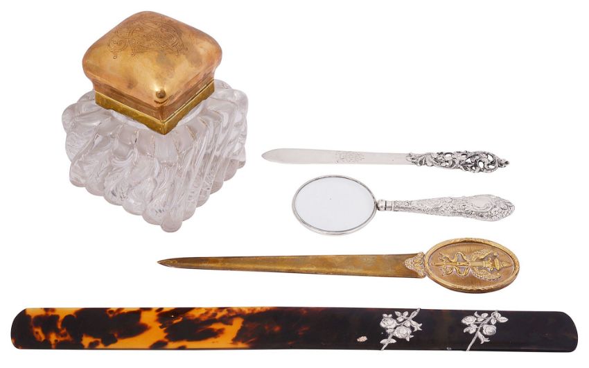 first having clear square spiral moulded glass boy plain hinged brass cover engraved with initials, fitted with liner, together with a large tortoiseshell page turner mounted with embossed trailing foliate decoration, flowers, a bird and an insect, an Edwardian embossed silver handled magnifying glass, a Norwegian .830 silver letter opener with foliate pierced handle, initialled and a brass letter opener, the oval terminal cast with winged flaming torch, (5)