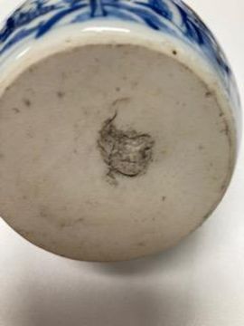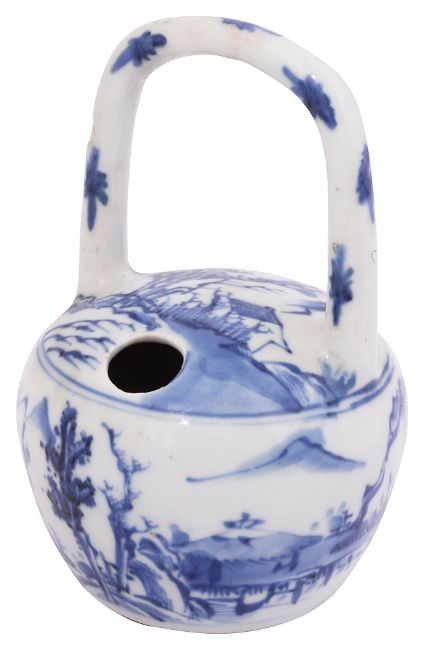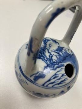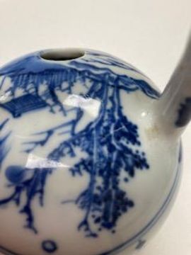 of globular form with loop hand, decorated in underglaze blue with a mountainous river landscape, .height 14 cm..Condition:Flaw to glaze on on handle Either very old damage or firing fault. Otherwise no chips or losses or damages ,
