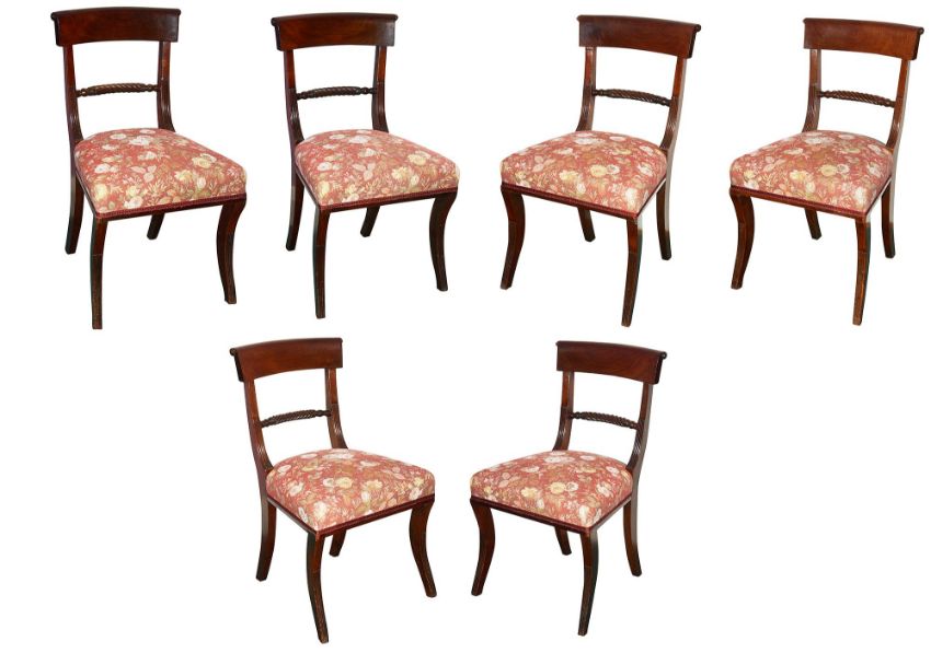 the curved top bars above rope twist turned mid bars, the seats on stop fluted sabre legs, (6),.height 84cm, width 48cm, depth 43cm,.Condition:Two chairs have had repairs to their back legs where the legs near the seat edges. Another chair has a visible peg in this area, though there is not evidence of a break. Scratches and wear overall.