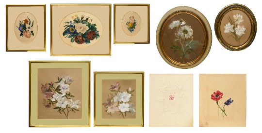 early 19th century and later, each painted with floral sprays, several with gouache and pencil details, two bearing monogram, seven within frame, two unframed, (9)