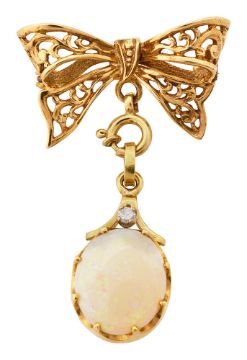 An opal fob pendant broochthe claw-set oval opal cabochon with a diamond detail above suspended from an 9ct yellow gold openwork bow brooch, Birmingham hallmarkoverall