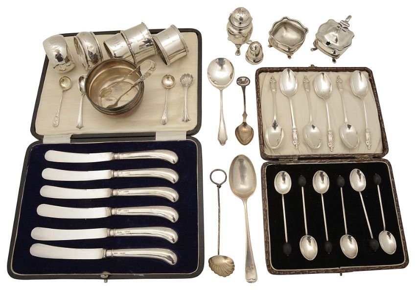 A set of six George V apsotle spoons and tongs and other silvervarious dates, makers first Birmingham, 1916 by J Sherwood and Sons, together with a cased set of six coffee spoons with bean terminals, a cased set of six pistol grip handled butter knives with stainless steel blades, five assorted napkin rings, a mustard pot with blue glass liner, a late Victroian pepper pot, a novelty acorn pepper pot, assorted spoons, (qty) various weighable silver approx. 13.93 ozt.
