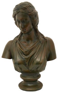 A bronzed terracotta bust of a classical maidenwith a pinned toga and raised on a circular socle