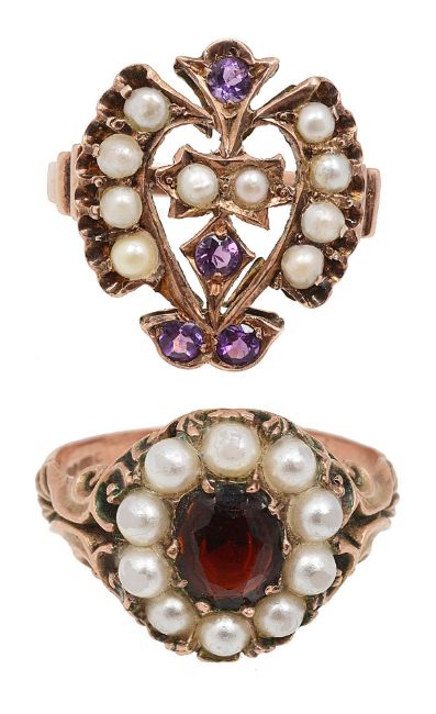 An amethyst and half pearl ringof ornate open work design, to the ridged shoulders and plain tapering shank (sized); together with an oval garnet and simulated pearl cluster ring to the 9ct yellow gold scrolling setting and shoulders, London hallmark, (2)ring sizes N and K respectively, combined gross weight 6.0g