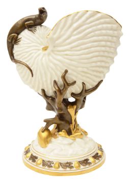 A late 19th century Royal Worcester nautilus vasemodelled as a nautilus shell surmounted by a bronzed lizard, supported on gilt and bronze branch coral, on a circular naturalistic base with seashells, impressed and printed factory marks in black, impressed V5493