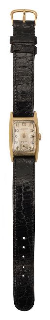 An 1930s American gold cased Hamilton wristwatchsilvered dial with with raised Arbaic numerals, minute track subsidiary seconds dial and gold hands signed Hamilton, 19 jewel movement signed and numbered, rectangular tonneau shaped case, case back stamped Hamilton Watch Co. Lancaster PA. 14K and numbered 98528, black leather bracelet stamped Asprey, with gold buckle stamped Hamilton 14kdial 25 x 18mm., case 39 x 23mm.