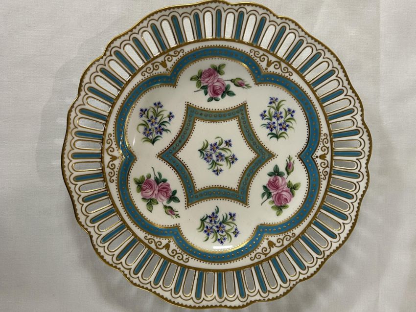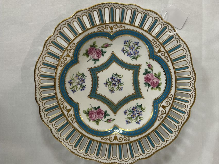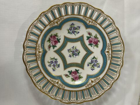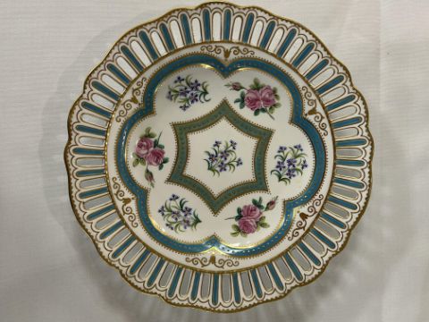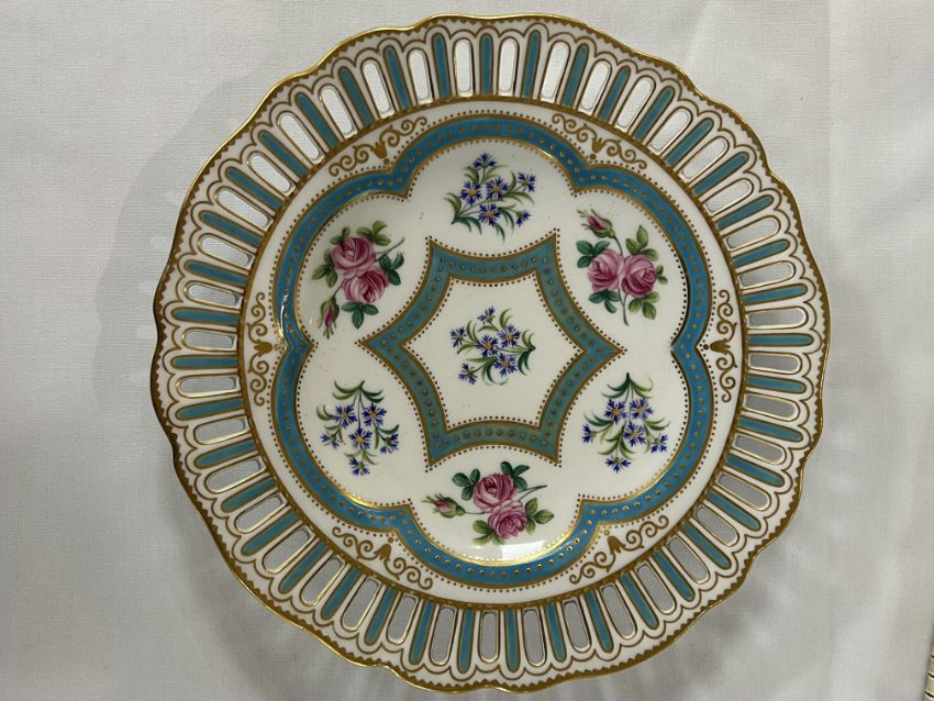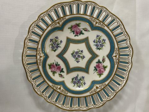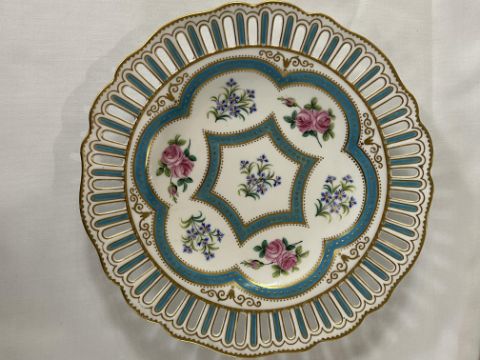 A set of six 19th century W.T. Copeland cabinet plates c.1870pattern no, 9324, pierced shaped borders, decorated with sprays of roses and cornflowers within gilt jewelled turquoise borders, printed factory marks painted pattern no.diameter 25 cm.