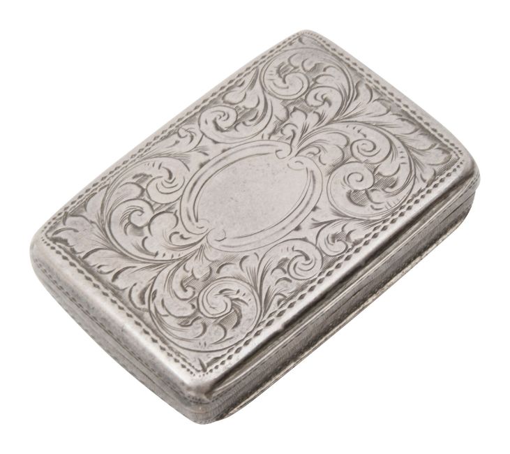 An early Victorian silver vinaigretteBirmingham, 1851 by Nathaniel Millsrectangular cushion form, the hinged cover and base with engraved foliate decoration, gilt interior with hinged foliate pierced grille