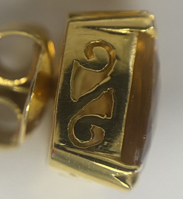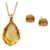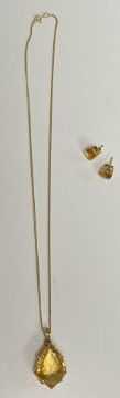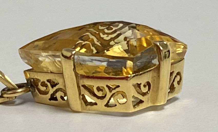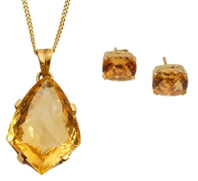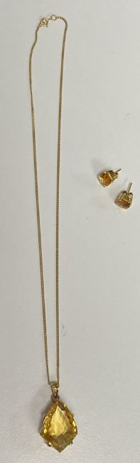 A citrine necklace and earring seton a flat curb link chain, claw set to a pierced scrolling gallery with a pair of citirine earrings of a similar design (3)Necklace