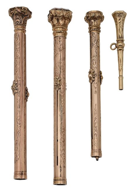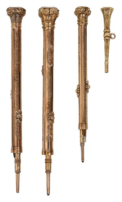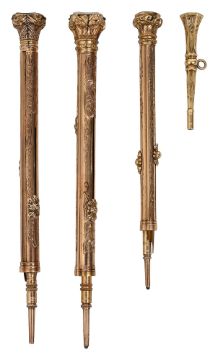 Three late Victorian gold cased combined pens and propelling pencils and a watch keyunmarked all with foliate engraved decoration, sliding action and hardstone set capital terminals, the largest with intaglio engraved end stone and the barrel engraved 'Dr Weir', (4)largest