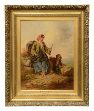 Condition: Set within an attractive gilt frame. Evidence of possible relining and re-stretching. There is general surface craqueler to the sky. There is minor evidence of retouching to the central right foreground. There is a stain that runs from the central figure's pocket to the skirt. There is evidence of significant paint loss to the right hand side of the central figure, which has been retouched. There is evidence of a minor repair to the extended arm, above the elbow of the central figure. This item has not been examined out of the frame and it is recommended to be viewed in person.