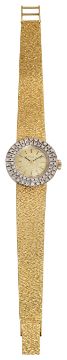A Longines lady's 18ct gold and diamond wristwatchthe circular textured gold dial with baton numerals and bezel set with double row of brilliant-cut diamonds, quartz movement, the textured tapering strap bracelet and deployant clasp with import hallmark