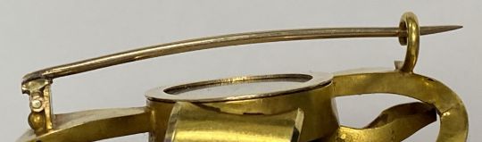 A mid Victorian diamond and bloomed yellow gold brooch, designed as a bow with glazed compartment to the reverse, centrally-set with a cushion-shaped old brilliant-cut diamond within a star motif,width 4.8cm, max depth 2.8cm, 18.6g