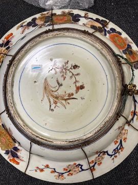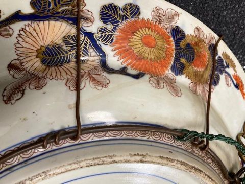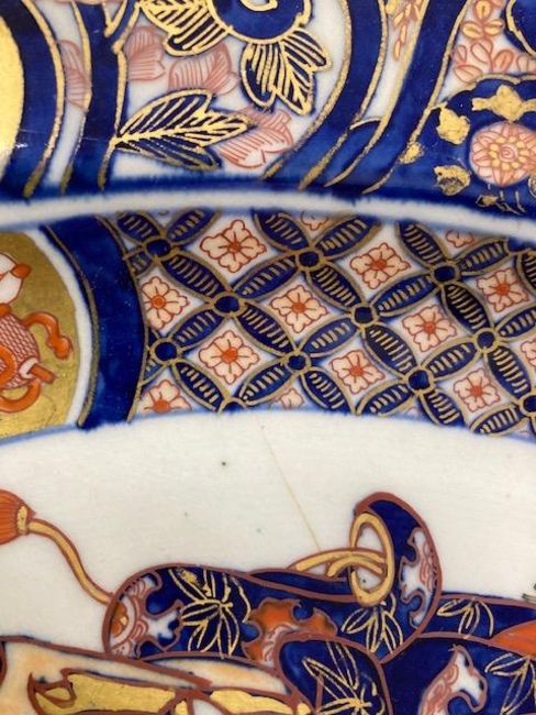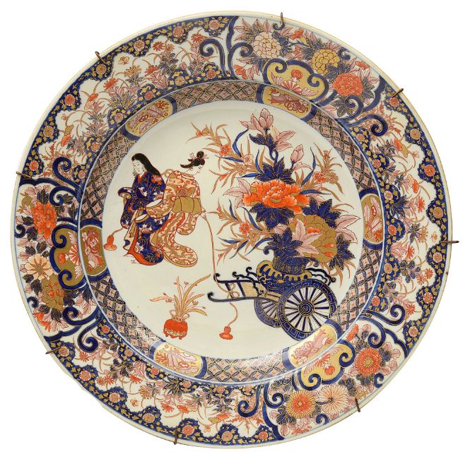 A large Japanese Meiji period Imari decorated Arita chargerthe centre painted with two gesiha, a rickshaw and a flower basket, floral panelled bordersdiameter 55.5cm