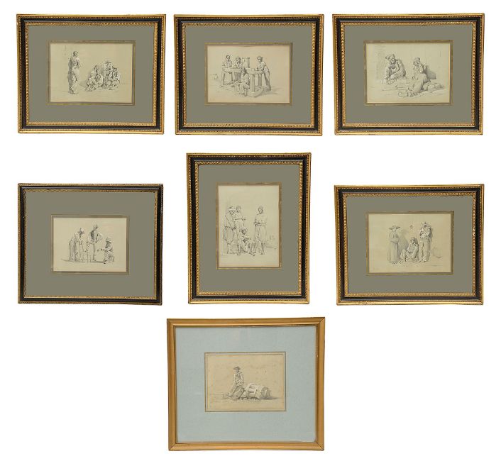Continental School (Circa 1900) A collection of seven pencil and gouache illustrations,each depicting street scenes of gentlemen in Southern European and North African modes of dress, variously inscribed each numbered, each framed and mounted, (7) the North African figures within frame 24cm x 17.5cm