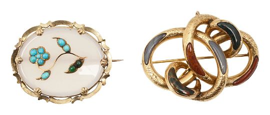 Two 19th century hardstone brooches: the first of oval white chalcedony applied with a forget-me-not spray in cabochon turquoise collet-set to the 'C' scroll border; the second of entwined scrolling design in engraved yellow gold and inlaid with various polycrystalline quartzthe first 4.3cm x 3.6cm; the second 5.1cm x 3.7cm
