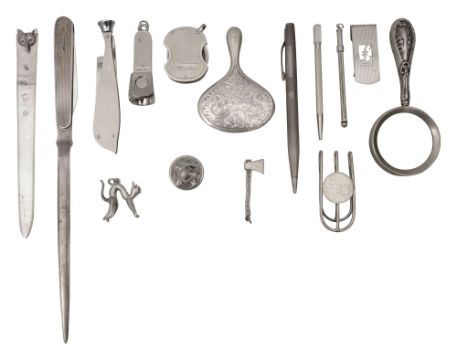 A collection of modern silver vertu to include letter openers most Birmingham, 1978/79/80 by S J Roseto include a plain letter opener with fox mask terminal, a combination part engine turned letter opener folding steel bladed knife, a magnifying glass with embossed filled handle, an engine turned folding magnifier, a miniature hand mirror with foliate engraved decoration, a propelling pencil, an engine turned cocktail swizzle stick, two money clips one pierced with a pound sign, an engine turned silver mounted stainless steel cigar cutter and a pipe tamper with folding tools, a bridge pencil etc., (qty)first