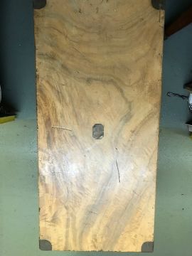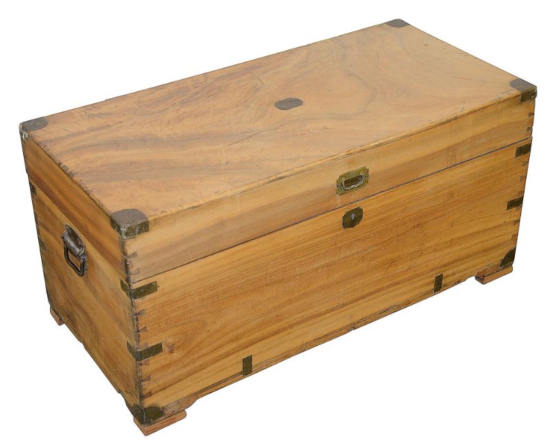 A Victorian camphor wood chestwith brass corner mounts and metal side carrying handles, the front with a countersunk handle, faded, on later block feetHeight 47cm, depth 45cm, Length 95cmCondition: Old marks and scratches to the top, three deep old scratches. The mounts to the lid are badly worn and discoloured.This lot must  be collected from the Auction venue by 1pm Friday 10th February.  Please arrange transport before this deadline.   Uncollected property will be transported to our offsite storage facility and collection can be arranged by appointment only.  Additional fees of £20 apply for the transport