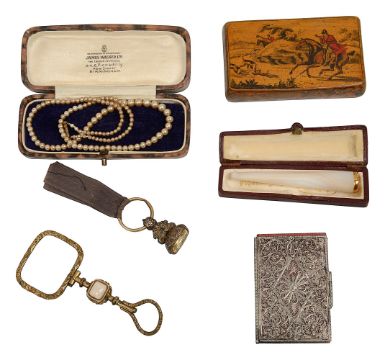 A collection of seven items of vertuto include: a cultured pearl necklace, the beads graduated and in a James Walker box, a marbled penwork snuff box with hunting scenes, a silver filigree needle case in the form of a book, spine lettered 'SOHO', a mother of pearl mouthpiece, boxed, a fob seal with a yellow stone, etched with a hand holding a quiver and a motto, a gilt brass quizzer and a coloured stone set oval brooch, (7)necklace