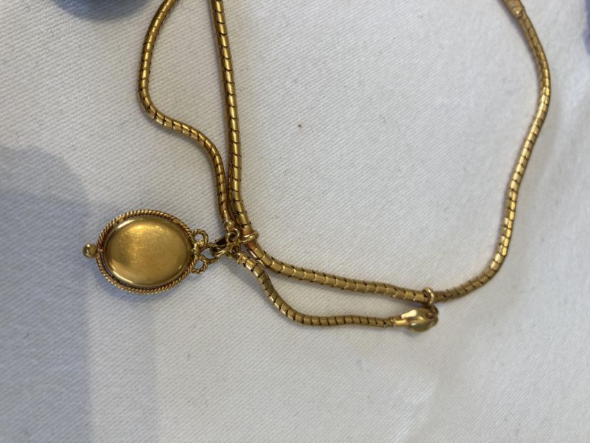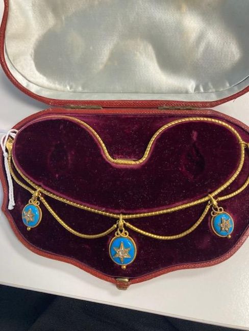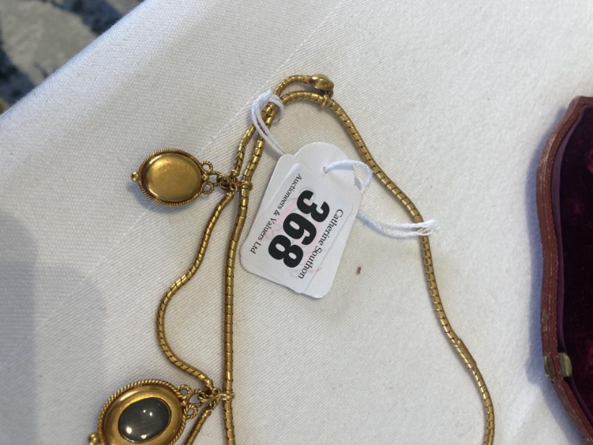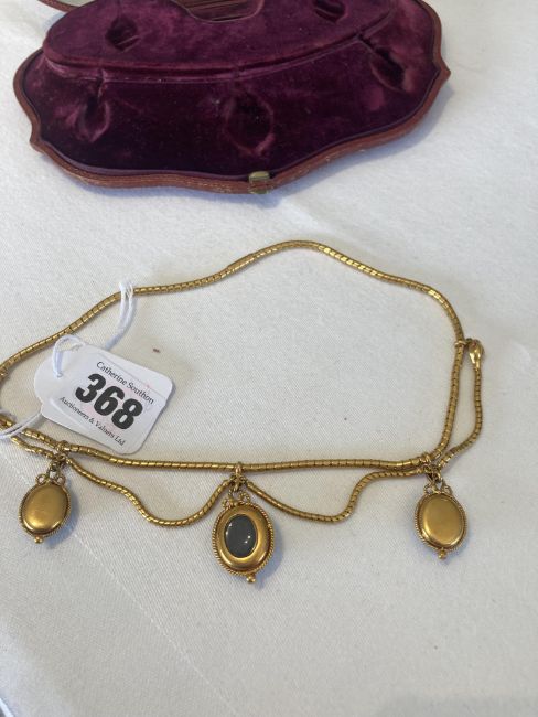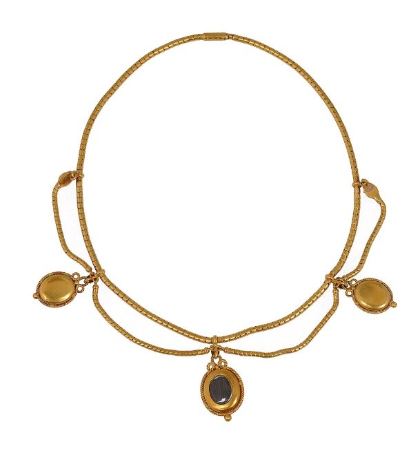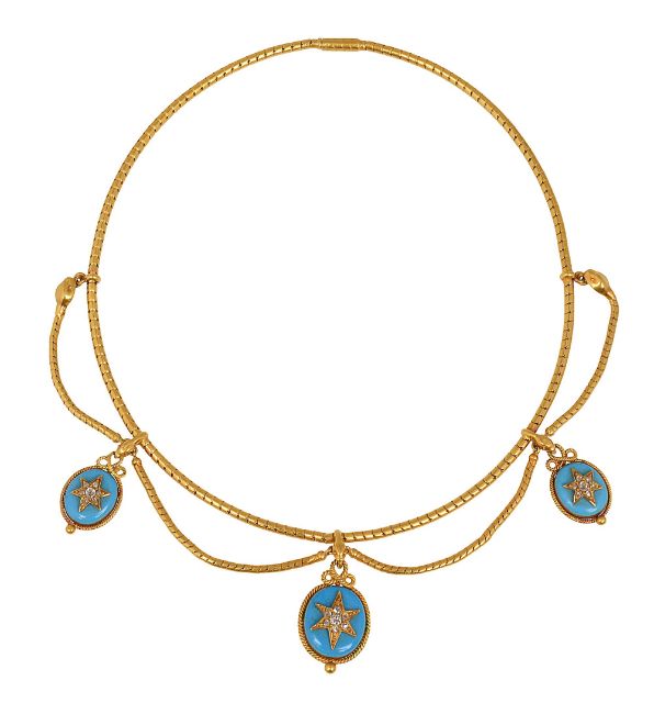 A mid Victorian yellow gold, enamel and diamond-set festoon necklace, the yellow gold snake link necklace suspending three graduated oval turquoise enamel pendants, the central pendant with glazed compartment to the reverse, each applied with a diamond-set star and within a ropetwist border to the snake's head surmount, contemporary fitted case