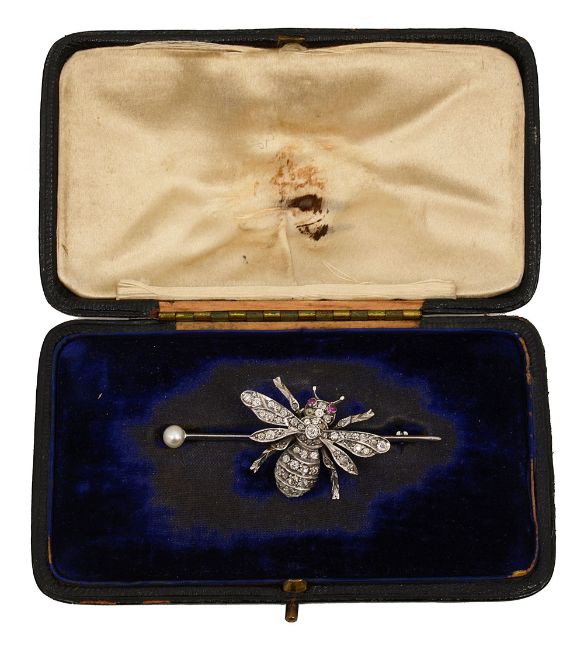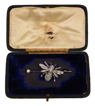 A diamond-set and pearl bee bar brooch the old brilliant-cut and single diamond-set bee in flight with cabochon ruby eyes, detachable from the knife-edge bar brooch with a bouton pearl (untested) terminal, probably mid 19th century and later rhodium plated, contemporary fitted case bee: maximum width 3.2cm; bar brooch