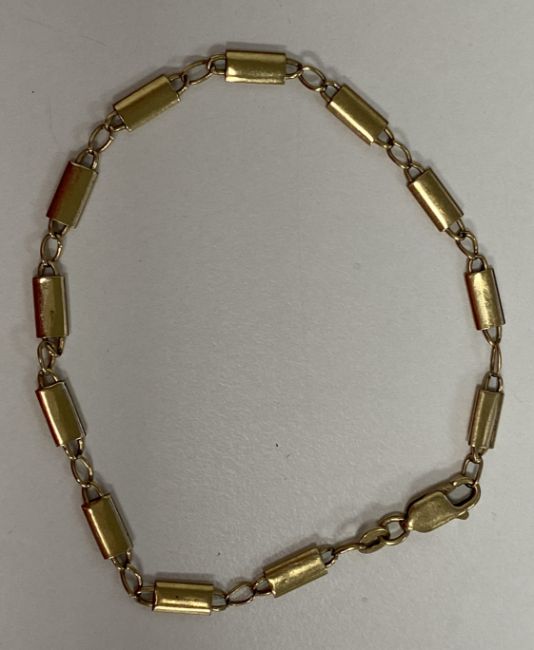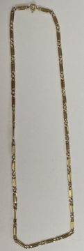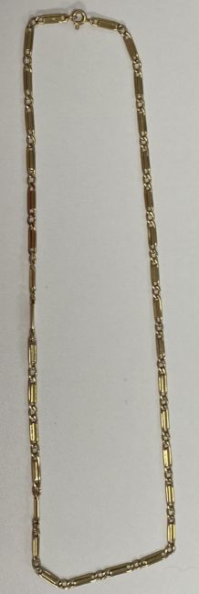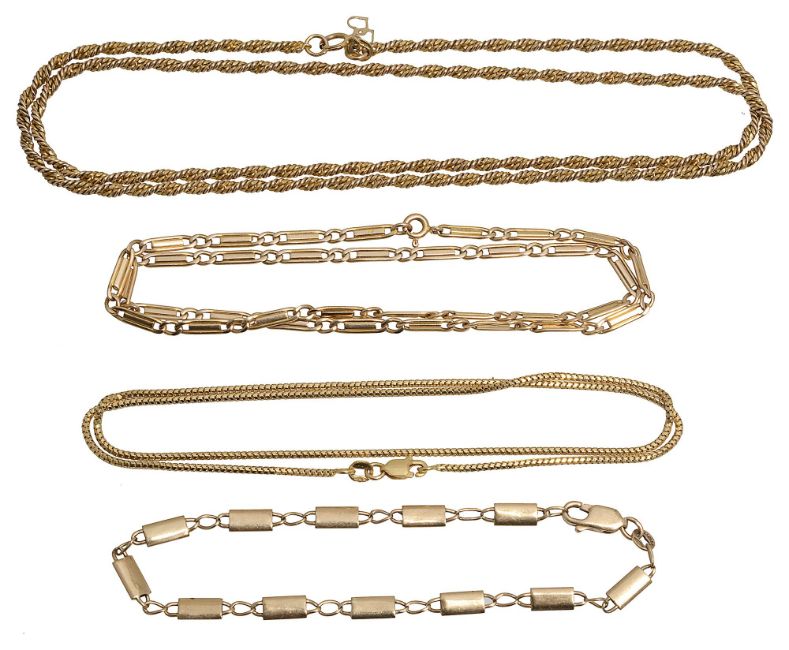 A group of four chains to include 9ct one rope chain, clasp marked '375' with interlocking hearts tag attached to the clasp, a 9ct gold fetter link chain, stamped to link '375', a 9ct gold fetter link bracelet and a chain indistinctly marked tag attached to clasp, (4)Rope chain
