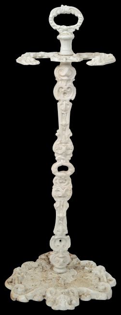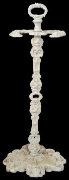 A Victorian cast iron hall stick/umbrella standpainted white, pierced foliate scroll design column with carrying handle issuing twin curved rests terminating in dog mask terminals, the shaped tray with mask, scroll and snake border
