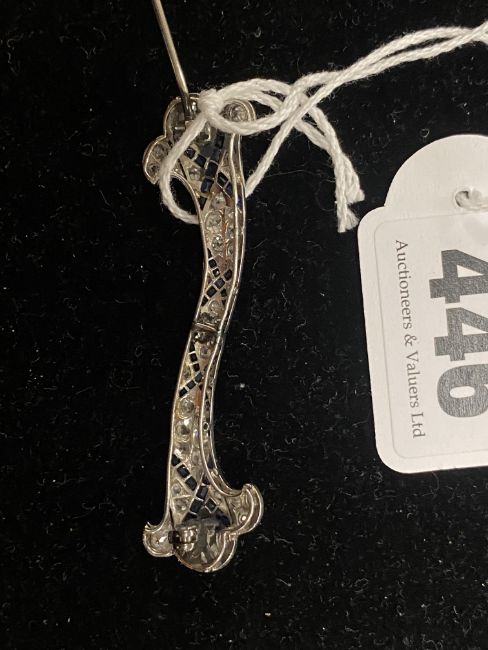 A diamond and sapphire-set broochof scrolling design with cusped terminals, set throughout with old brilliant-cut diamonds, and interspersed by four channel-set calibré-cut sapphire crosses, possibly converted from a pair of double clips