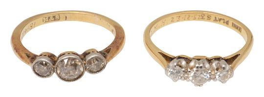 Two diamond three stone ringseach set with three graduated brilliant-cut diamonds, the second stamped '18CT PLAT' , both engraved with initials and date to the inner shankring size : the first L/M, the second N, combined 5.7g