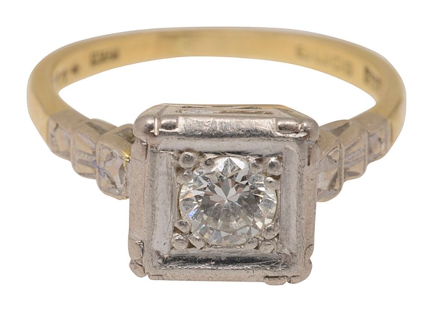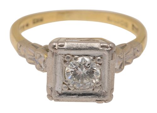A diamond ring the brilliant-cut diamond estimated to spread 0.25ct box set to the stepped shoulders, the shank stamped 'PLAT and hallmarked 18ct yellow goldring size K, 3.8g