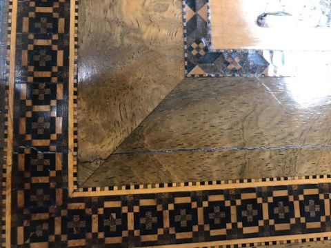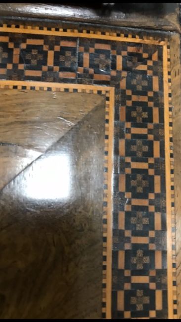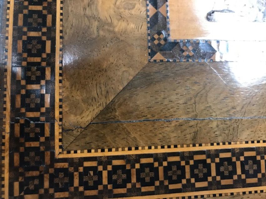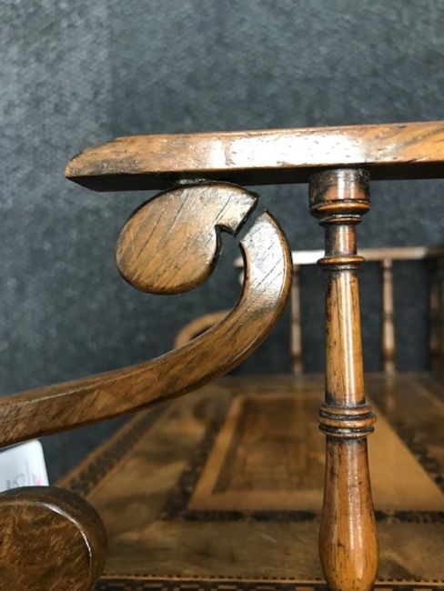 Condition: Crack to one end scroll of the gallery. Repolished, some minor lifting and some splits to veneer. Tiny veneer loss to rear right corner of top edge.