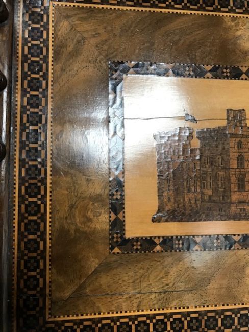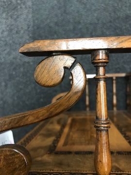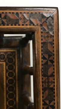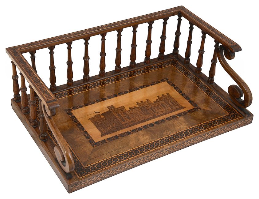 A Tunbridge Ware rosewood book stand c.1840three quarter turned spindle gallery with scroll ends, the top rail inlaid with micromosaic border, the base inlaid with a mosaic panel depicting the State Apartments, Windsor Castle within geometric and walnut banded borders