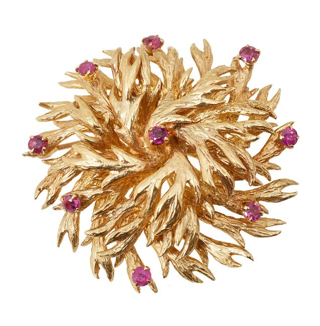 A 9ct yellow gold textured tiered frond broochclaw-set with nine circular-cut rubies, London hallmarkdiameter 4.3cm approx, 26.5gm