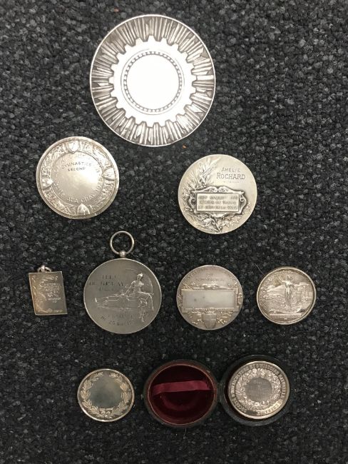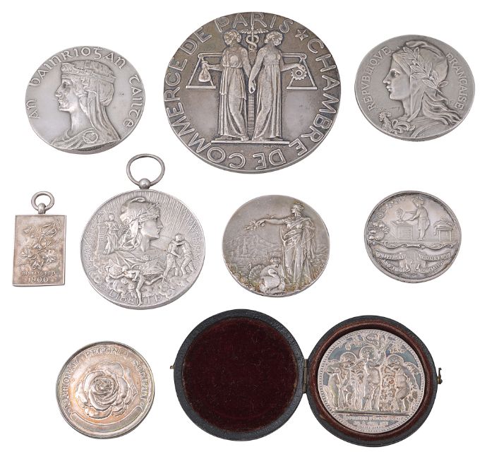 A collection of mostly early 20th century silver prize and commemorative medals comprising Ireland, Free State Tailteann Games prize medal, 1928 engraved verso Gymnastics Second, France: Chambre de Commerce De Paris medal, 1937 by PM. Poisson, cased Exposition D'Horticulture, 1887 medal by A. Dubois, Republique Francaise commemorative by F. Rasumny, Italy Comizio Agrario Di Novara by Johnson, Britain: Universal Cookery and Food Association Currant Competition London 1906 prize medal by Restall, National Sweet Pea Society prize medal and National Begonia society silver medal, (9)first diameter 26 mm., silver weight approx. 16.16 ozt