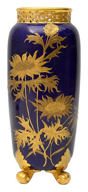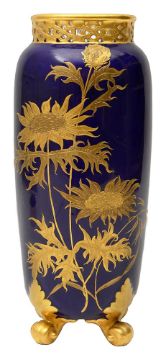 A Grainger & Co Worcester porcelain vaseof ovoid form, on a dark blue ground and with gilt details, the pierced collar above a flowerhead and foliate decorated body, on four scroll feet