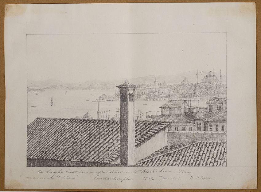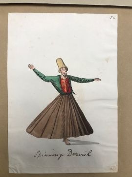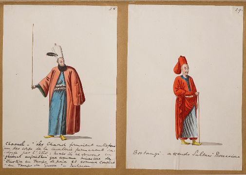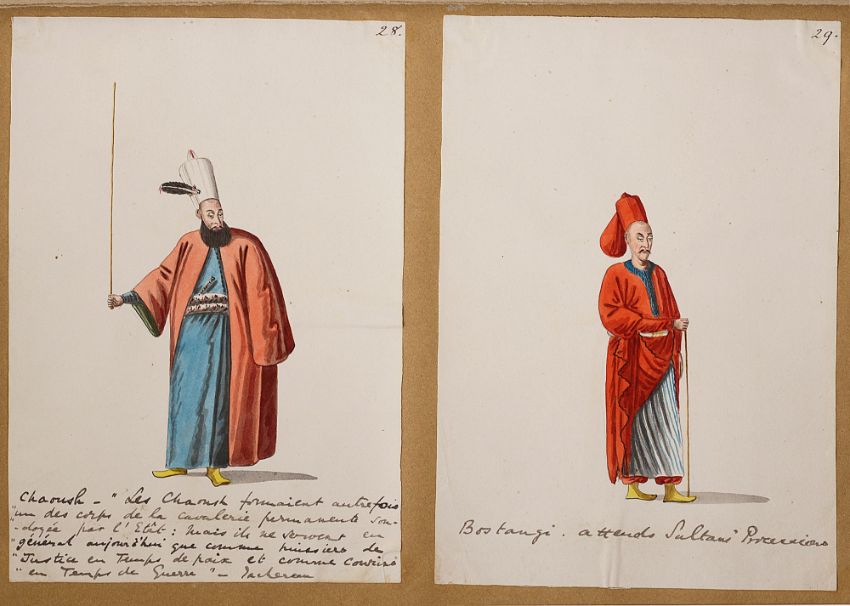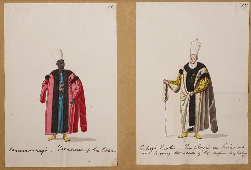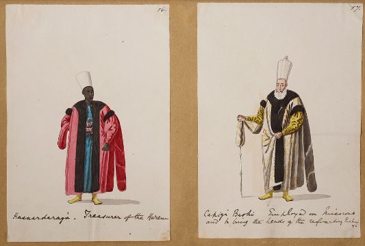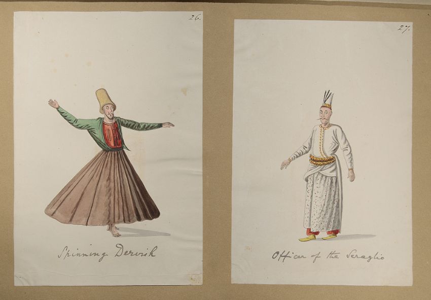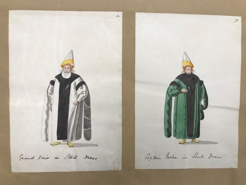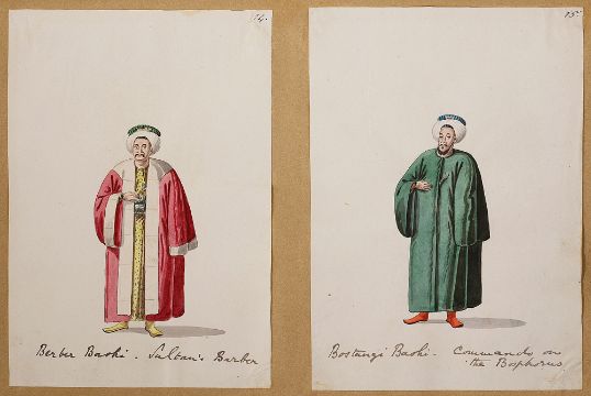 Travel History: An interesting early 19th century album relating to Ottoman Empire, Benjamin Franklin and European travel,containing; forty four watercolour portraits of figures in Turkish dress, after Dalvimart (Octavien Alexander William) "The Costumes of Turkey", depicting courtly and other figures in typical clothing each with inscription in English, figures including Sultan Mahmout II, Son of Sultan Mahmout II, Grand Vizier in State Dress, Captain Pacha in State Dress, Kislar = Aga Chief of the Black Eunuchs, Hamadgi: Chief Boatman of the Sultan, Chiboukgi Bashi Chief Pipe Bearer, Dwarf in the Seraglio (A Jester) amongst others, the album additionally containing a number of topographical watercolours of Constantinople, coloured printed views of Switzerland, a watercolour after Charles van Loo, marine watercolours, a number of printed portraits of Benjamin Franklin, printed portrait of Charles Lord Montagu (Charles Francis Greville), within marbled boards with Morocco leather spineoverall 36cm high x 26.5cm wideCondition: Losses and splitting to spine, cover loose, some staining to watercolours - generally bright. The Starbuck Family thence by descent.Of the 44 watercolours, some are loose, but most are still stuck down. Most have minor marks to their corners and some creases in places, mostly to the corners Some corners have marks where the glue underneath has left an impression. Some have foxing in the backgrounds and some backgrounds are more stained and less white than others. See the images of various examples.