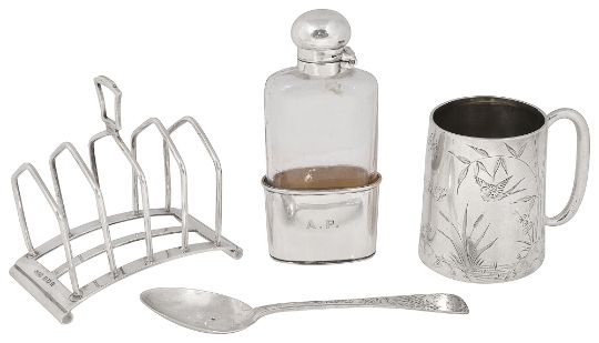 Condition: Christening mug with crack to rim by upper handle joint. Rubbing to gilt interior. Spoon with dents to bowl. toast rack in good condition. Solder repair to hinge of hip flask