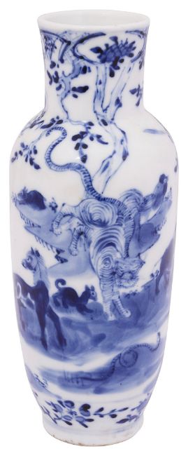 A 19th century Chinese blue and white porcelain vaseof shouldered tapering form, decorated in underglaze blue with all twelve animal Zodiac animals in a landscape, underglaze blue four character Kangxi mark