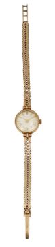 A lady's 9ct gold Garrard wristwatchcircular silvered sunburst dial with raised hour baton markers and gold hands, signed Garrard, 17 jewel manual wind movement, tapering articulated chevron link bracelet with foldover clasp