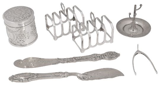 Victorian and later silver to include a lidded pot, pair of toast racks and butter knivesfirst London, 1896 by William Hutton & Sons, circular, repousse embossed with with C scroll framed cartouches and foliate decorated, initialled A, together with a pair George VI small four division toast racks, Birmingha, 1947, by Henry Clifford Davies, two Victorian butter knives with foliate engraved blades and filled handles, an Edwardian ring tree, a pair of Edwardian novelty sprung wishbone sugar nips, (7)First