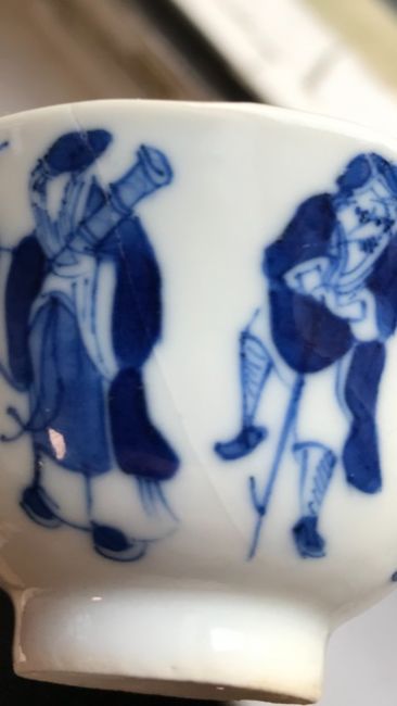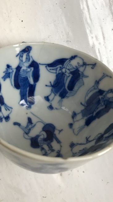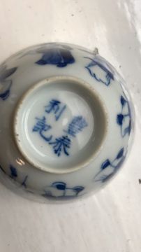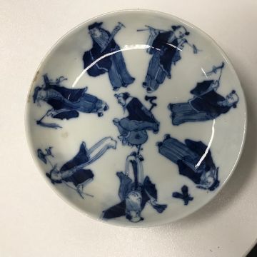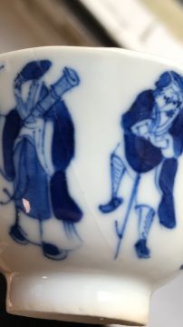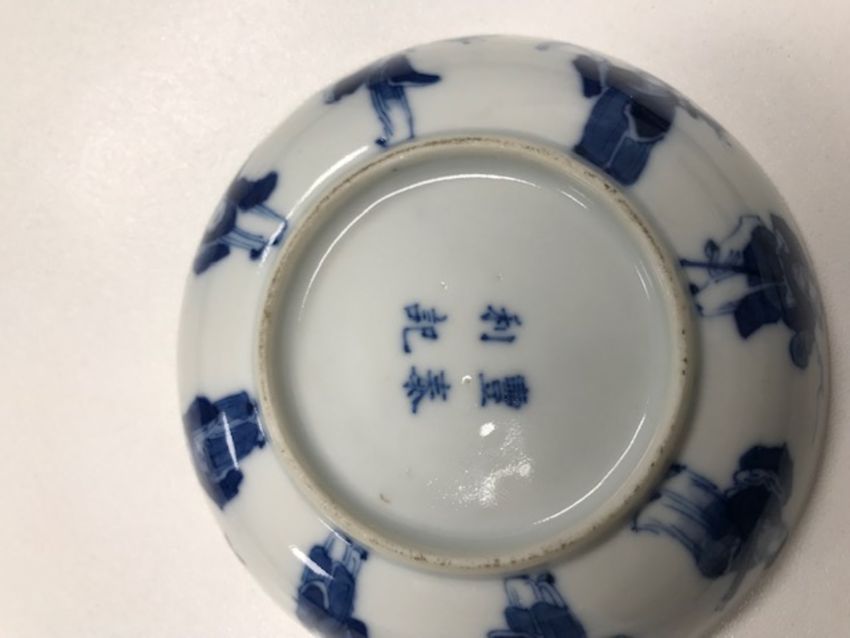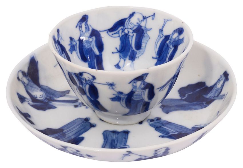 A late 19th century Chinese blue and white porcelain Immortals tea bowl and saucerQing Dynastyboth decorated to interior and exterior in underglaze blue with the eight Immortals, four character mark