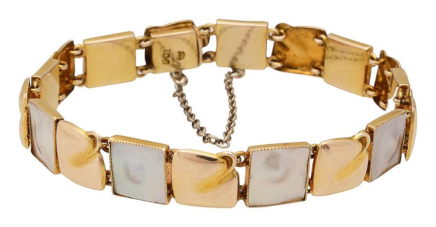 A Murrle Bennett 9ct gold and mother of pearl Arts and Craft braceleteach mother of pearl panel set in millegrain pattern edged links with contrasting gold links with hammered leaf design, stamped on the clasp 9ct and MB