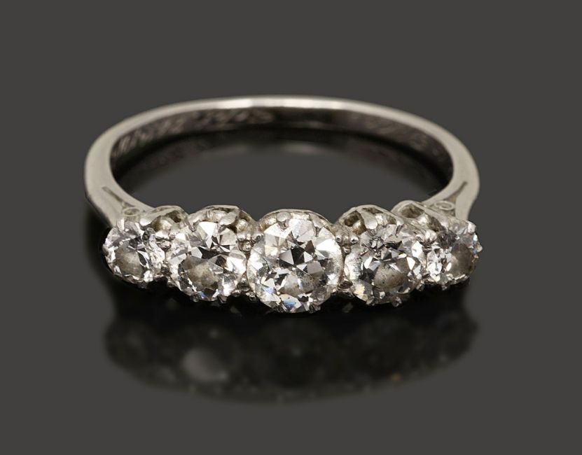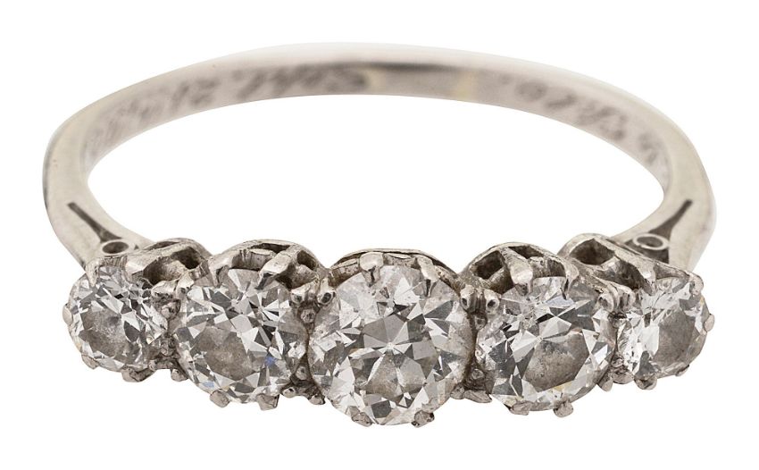 A graduated five stone diamond ring the old brilliant-cut diamonds coronet-set to the plain tapering shank, the interior with a presentational inscription dated 1919 ring size O, 3.6g